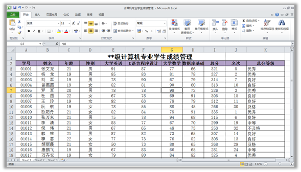 本案要求在 Excel 中制作一张“期末成绩表”工作薄,其中涉及的操作有:在单元格中输入和编辑数据,填充序列,设置数据的有效性,插入、删除和移动单元格,修饰工作表等。读者通过本案例的学习,能基本掌握电子表格的编辑与格式化方法。编辑完成的“期末成绩表”参考效果如图 3‑1所示。