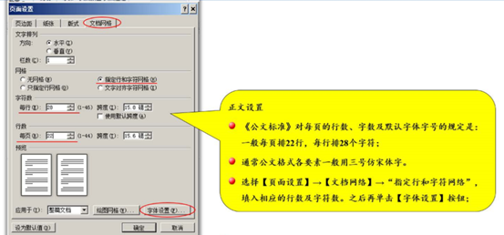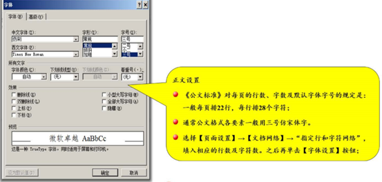 《标准》对每页的行数、字数及默认字体字号的规定是:一般每页排 22 行,每行排 28 个字,并撑满版心,特定情况可以进行适当调整;如无特殊说明,公文格式各要素一般用三号仿宋体字,特定情况可以进行适当调整。