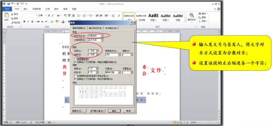 输入发文字号与签发人,将文字对齐方式设置为分散对齐,设置该段的左右缩进各为一个字符,然后在发文字号与签发人之间键入若干个空格,使它们挤向两端,这样就可以完成发文字号居左空一个字、签发人居右空一个字的设置,如图 1‑93所示。