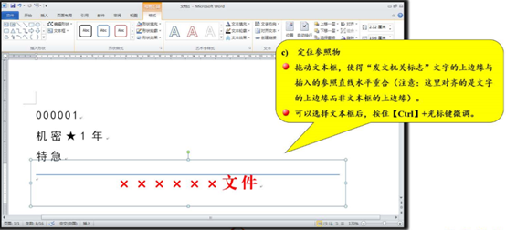 拖动文本框,使得发文机关标志文字的上边缘与插入的参照直线水平重合(注意:这里对齐的是文字的上边缘而非文本框的上边缘),如图 1‑91所示。为了精准定位,降低误差,可适当放大视图显示比例。