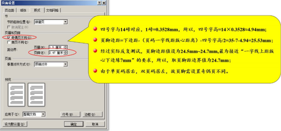 根据《标准》规定,页码一般用四号、半角、宋体阿拉伯数字,编排在公文版心下边缘之下,数字左右各放一条一字线;一字线上距版心下边缘 7 mm。单页码居右空一个字,双页码居左空一个字。四号字与 14 磅对应,1 磅=0.3528mm,所以,四号字高=14×0.3528≈4.94(mm)。页脚边距=下边距-(页码一字线距版心距离)-四号字高/2 =35-7-4.94/2=25.53(mm)
