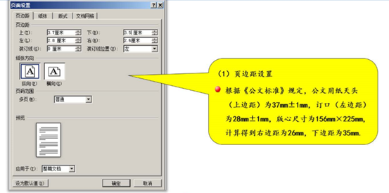 根据《标准》规定,公文用纸天头(上边距)为 37mm±1mm,订口(左边距)为 28mm±1mm,版心尺寸为 156mm×225mm,计算得到右边距为 26mm,下边距为 35mm。在页面设置对话框中进行页边距的设置,如图 1‑82所示。