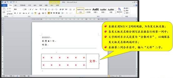 表格采用 N 行×2 列的规格,N 为发文机关数。各发文机关名称分别写在表格各行的第一列中,文字的对齐方式设置为“分散对齐”,以确保各发文机关名称文字两端对齐。表格第二列合并居中,输入“文件”二字。表格设置无框线、无填充,调整合适列宽,将整个表格对象设为水平居中对齐。然后采用与设置文本框类似的方法进行设置,使其与参照直线对齐。