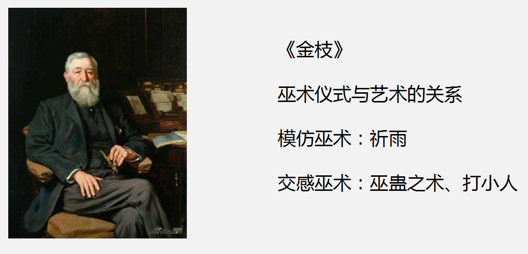 后来,英国著名的人类学家詹姆斯弗雷泽在其代表作《金枝》中,对这种思想观念作了进一步的概括.并且较早地论及了巫术仪式与艺术的关系。提出了两种巫术的原理,一种是模仿巫术,例如祈雨,实施方式是通过模仿达到目的。另一种是交感巫术,例如我们在电视剧中见过的针扎小人啊、符咒呀等等。实施方式是利用与某人相关的一样东西从而实现对这个人施加影响的目的。不管是用哪一种巫术原理,都少不了原始巫术的仪式活动。