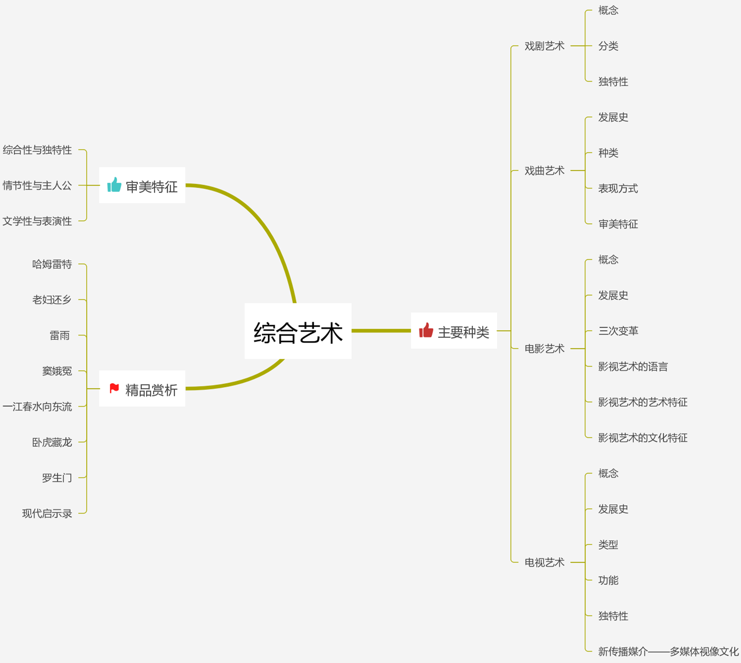 2.戏剧艺术:广义(戏剧包括话剧、戏曲、歌剧、舞剧、音乐剧)、狭义(话剧)。