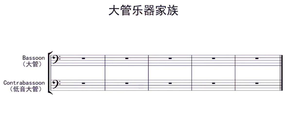 大管乐器家族当中,主要包括了大管和低音大管这两种,如果大家觉得这是比较复杂的,那我们可以暂时先记住这4种乐器,长笛(Flute),双簧管(Oboe)、单簧管(Clarinet)、大管(Bassoon)。