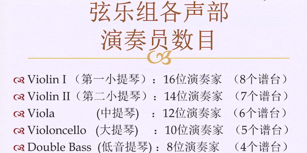 弦乐组是整个交响乐队当中人数最多的乐器组,因为每一个声部都需要很多的演奏家来共同完成,这样一来呢,一共就会有几十位演奏家在演奏,在比较理想的情况下,如果一个交响乐团的编制齐全,那么乐队的第一小提琴通常应该是16位演奏家,第二小提琴也差不多,应该是14个人中,中提琴至少应该有12人,大提琴应该有10个人,低音提琴至少应该有8人,如果我们按谱架来计算,两个人一个谱架,从第一小提琴到低音提琴谱架的数量就是8、7、6、5、4。