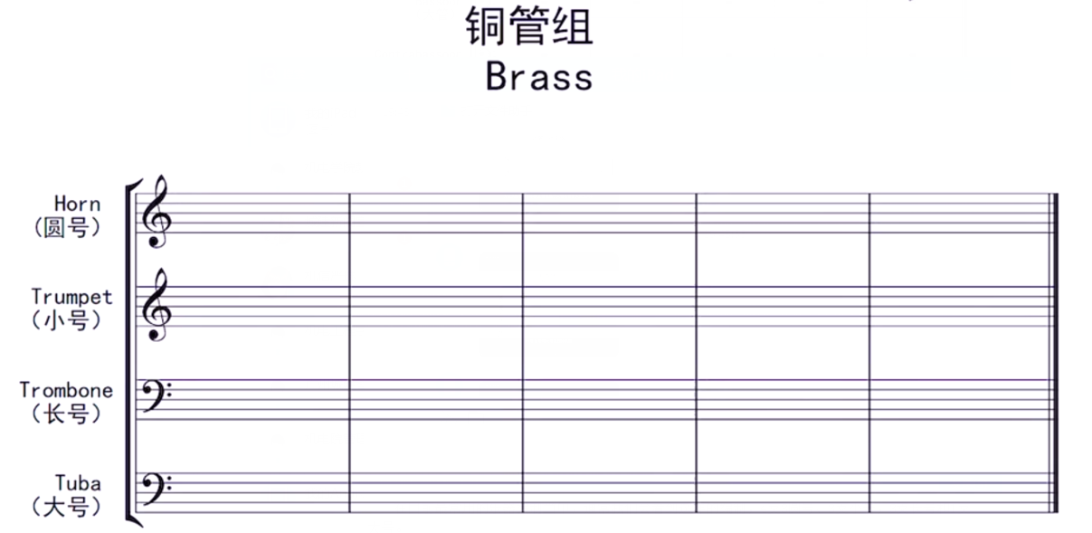 下来我们看一下铜管组,在交响乐队当中,完整的铜管组通常包括圆号、小号、长号和大号这4种乐器。