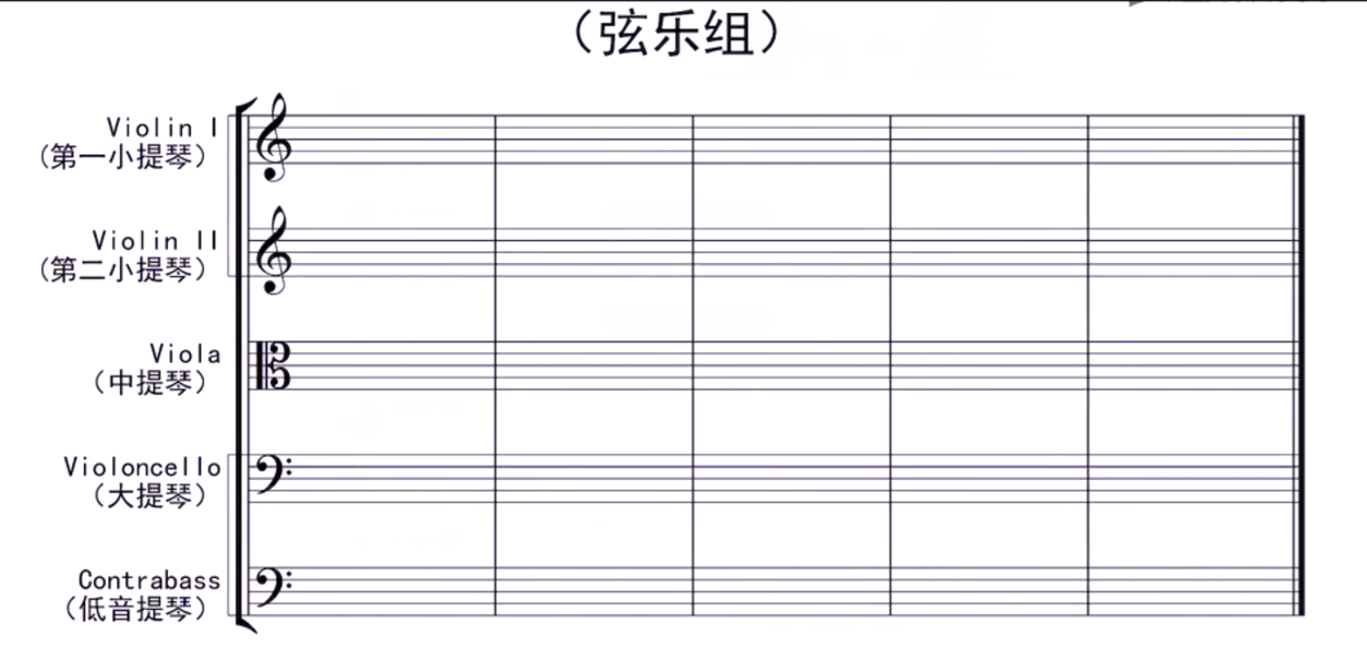在交响乐队的总谱当中,从上到下依次是木管组,铜管组,打击乐,组钢琴,竖琴和弦乐。