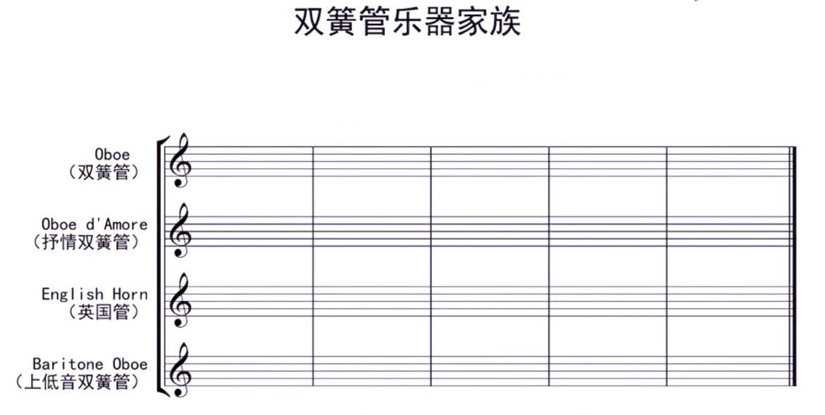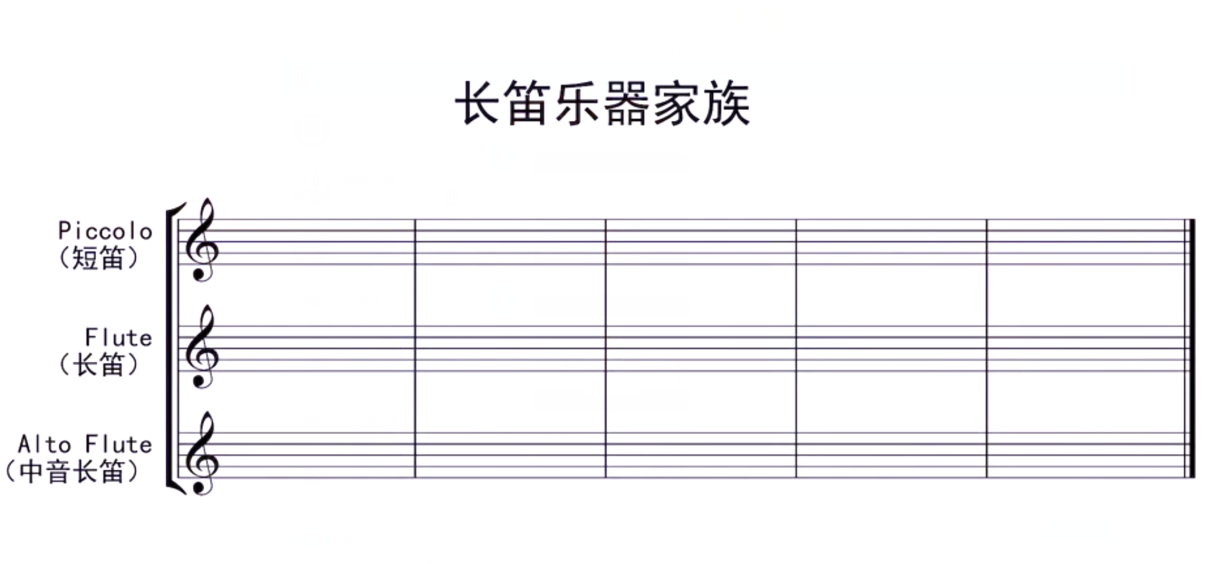 接下来我们看一下木管组,木管组的乐器比较多,可以分为4个类型的乐器家族,其中长笛乐器家族里面有短笛,还有各种各样的长笛。