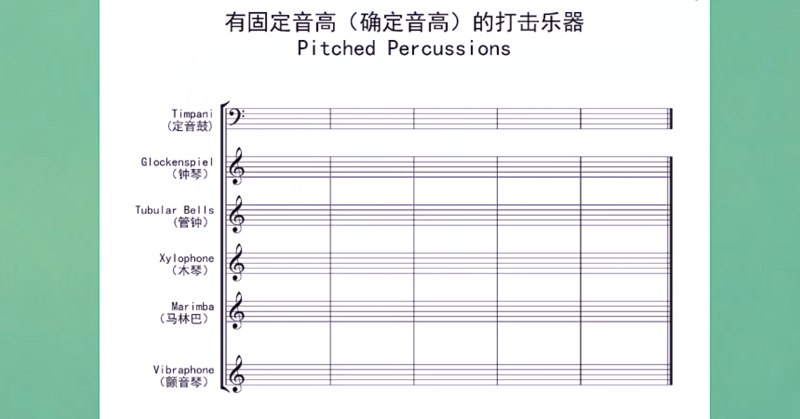 第一个是有固定音高的打击乐器,第二个是无固定音高的打击乐器。