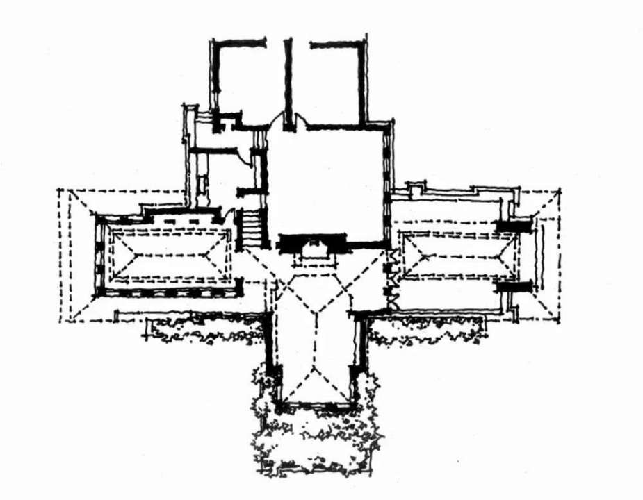 平面常做成十字形,以壁炉为中心,起居室、书房、餐室都围绕着壁炉布置,卧室一般放在楼上。室内空间尽量做到既分隔又连成一片,并根据不同的需要有着不同的层高。起居室的窗户一般比较宽敞,以保持室内与自然界的密切联系。但由于在造型上强调水平向的,层高一般较低,出檐又大,室内光线往往比较暗淡。