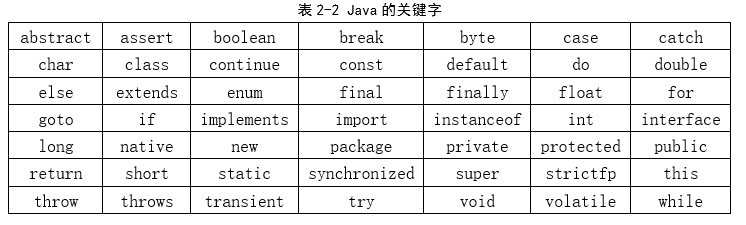 和其它语言一样,Java也有许多关键字,如public、void等待,关键字是不能当标识符使用。下列表格列出了Java中的关键字,这些关键字并不需要强记,在以后的学习中会慢慢熟悉的。