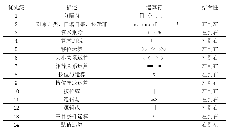 运算符的优先级决定了表达式中不同运算执行的先后顺序。如关系运算符的优先级高于逻辑运算符,x > y && ! z相当于( x > y ) && ( ! z )。运算符的结合性决定了并列的相同运算的先后执行顺序。如对于左结合的“+”,x + y + z等价于 ( x + y ) + z,对于右结合的“!”,!!x等价于 !( ! x )。运算符的优先级与结合性如表所示。
