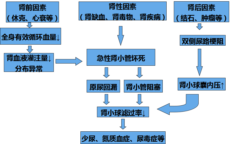 (1)、肾前性急性肾衰竭:常见血容量减少、有效动脉血容量减少和肾内血流动力学改变。