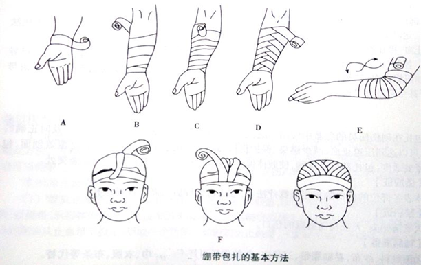 1.绷带包扎 绷带包扎是外伤急救中的常用技术,其作用有加压包扎止血,固定敷料,现场固定骨折、关节脱位或悬吊肢体等。