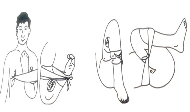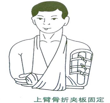 2.上臂骨折固定 先将患肢屈曲90°贴于胸前,在患臂外侧放置夹板,加衬垫后用绷带将骨折上下两端固定并悬吊于胸前,然后用三角巾(或绷带)将上臂在胸部固定。现场无夹板时,可将上臂下垂并用三角巾固定在胸侧壁,用另一条三角巾将前臂悬挂于胸前