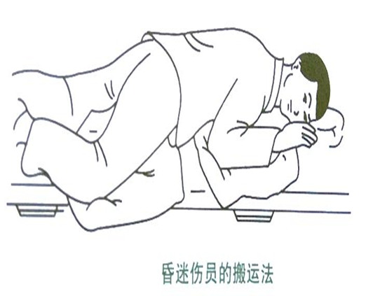 (1)昏迷病人:病人平卧或俯卧于担架上,头偏向一侧,以利于呼吸道分泌物引流。