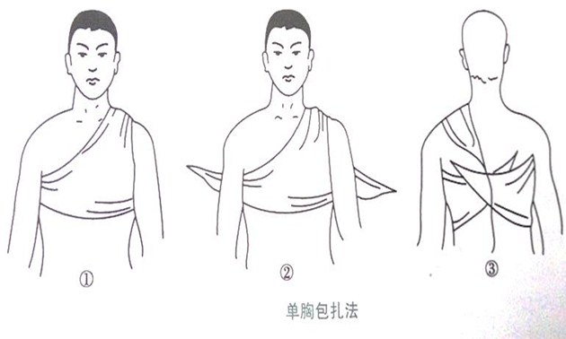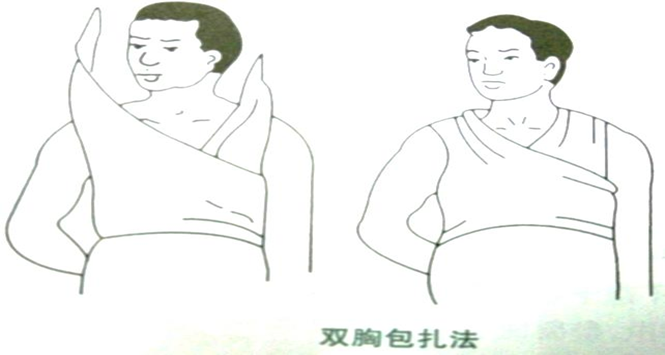 (5)胸(背)部伤的包扎:①单胸包扎法:将三角巾底边横放在胸部,约在肘弯上75px,顶角越过伤侧肩,垂向背部,三角巾的中部盖在胸部的伤处,两端拉向背部打结,顶角带拉下来绕过此结再打结;②双侧胸部包扎法:将三角巾叠成两燕尾角等大的燕尾巾,横放于胸部,顶角带绕过背部与一底边在腋窝下打结,一侧燕尾角绕过顶角带与另一侧燕尾角相遇打结