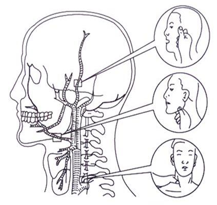 (2)颜面部出血:用一只手的拇指和示指或拇指和中指分别压迫双侧下额角前约25px的凹陷处,阻断面动脉血流。因为面动脉在颜面部有许多小支相互吻合,所以必须压迫双侧。