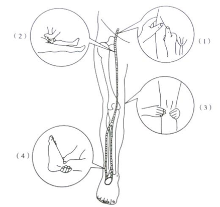 (10)足部出血:同时压迫伤侧足背中部近脚腕处的搏动点(胫前动脉)和足跟与内踝之间的搏动点(胫后动脉)