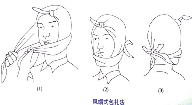 (2)风帽式包扎法:将三角巾顶角和底边中央各打一结成风帽状,顶角放于额前,底边结放在后脑勺下方,包住头部,两角往面部拉紧向外反折包绕下颌。