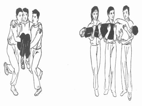 3)三人搬运法:对于怀疑脊椎损伤(颈椎没有损伤)的伤员,必须使用三人搬运法进行转移。三人一侧并排,一人托住肩背部,一人托住腰部及臀部,另一人托住双下肢,三人步调一致并同时轻轻将伤员抬起,随口令同时将伤员拉向胸部,以节省体力。待转移到木板担架或床边时,先同时将伤员托平,再步调一致的放在担架或床上固定