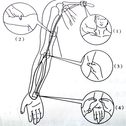 (6)前臂出血:压迫同侧肱二头肌内侧沟中部的搏动点(肱动脉),将其压向肱骨干