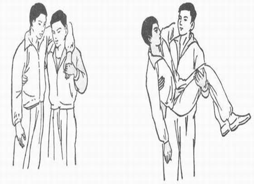 2)双人搬运法:①椅托式搬运法:两位救护者相对而立,一人以右膝,一人以左膝跪地,各将一手伸入伤员大腿之下并互相紧握,另一手彼此交差扶住伤员背部。②拉车式搬运法:一人站在伤员头部,两手插到伤员腋下将其抱在胸前,一个站在伤员足部,站在其两腿中间,用双手抓住两膝关节,两人步调一致慢慢抬起。注意此法不适用于脊柱损伤者