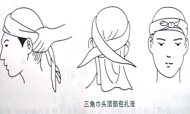 (1)头顶部包扎法:先将三角巾底边折叠75px,把三角巾底边放于前额与眉平齐拉到脑后,相交后先打一半结,再绕至前额打结固定