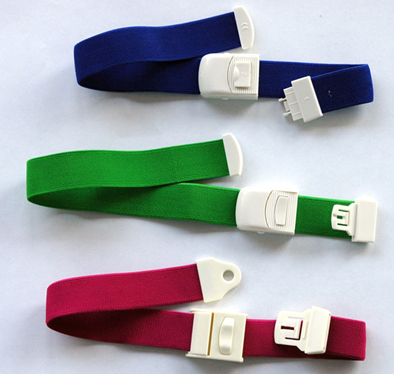 (2)卡式止血带止血法:将松紧带绕肢体一圈,然后将插入式自动锁卡插进活动锁紧开关内,一只手按住活动锁紧开关,另一手紧拉松紧带,直到伤口不出血为止。放松时用手向后扳放松板,解开时按压开关即可