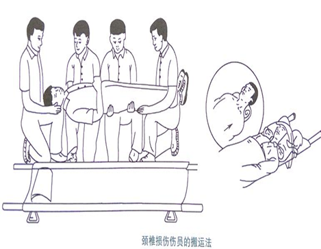 4)四人搬运法:对于怀疑颈椎损伤的伤员,必须使用四人搬运法进行转移。三人一侧并排,一人托住肩背部,一人托住腰部及臀部,另一人托住双下肢,第四个人立于头侧,双手掌面相对托住伤员头部,中指卡住伤员下颚角,稍微用力反向牵引,使头部与躯干平行。