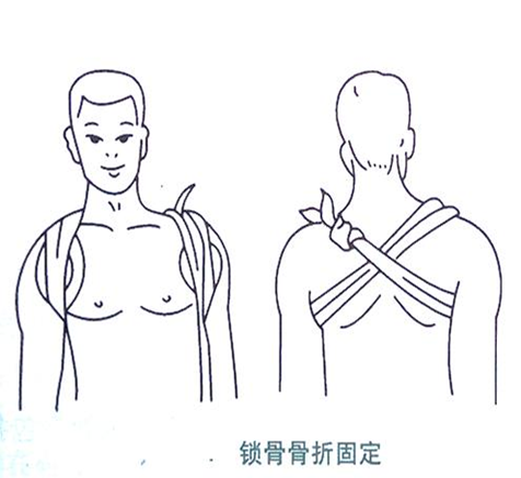 1.锁骨骨折固定 先于两腋前方用毛巾衬垫,并将三角巾折叠成带状,两端分别绕两肩呈反“8”字形,尽量使两肩外展、向后,拉紧三角巾的两个头端,最后在背后打结。也可用“T”字形夹板从背部扩展固定