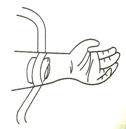 (7)手部出血:同时压迫患肢手腕横纹稍上方的内、外侧搏动点 (尺、桡动脉),将动脉压向尺骨和桡骨