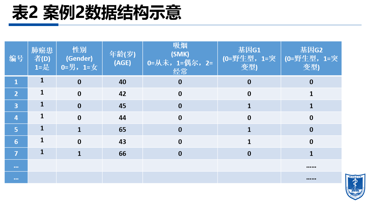 研究某种肿瘤的危险因素,采用病例对照研究,招募了1000名患者和1000名健康对照,记录了年龄、性别、吸烟情况及G1和G2这两个基因的情况。