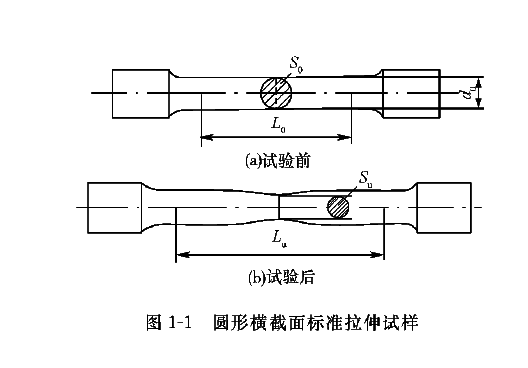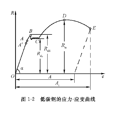 评价材料力学性能最简单和最有效的办法就是测定材料的拉伸曲线。将标准试样(见图1-1)施加一单轴拉伸载荷,使之发生变形直至断裂,便可得到试样伸长率 (试样原始标距的伸长与原始标距之比的百分率)随应力(试验期间任一时刻的力除以试样原始横截面积之商)变化的关系曲线,称为应力-应变曲线,图1-2为低碳钢的应力-应变曲线。