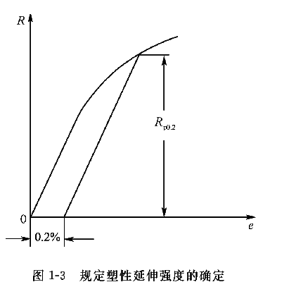在图1-2中, 应力超过B点后, 材料将发生塑性变形。在BC段,塑性变形发生而力不增加,这种现象称为屈服。B点所对应的应力称为屈服强度(sS)。屈服强度反映材料抵抗永久变形的能力,是最重要的零件设计指标之一。实际上多数材料的屈服强度不是很明显的,因此规定拉伸时产生0.2% 残余延伸率所对应的应力为规定残余延伸强度,记为(s0.2),如图1-3所示。(注:括弧内为旧标准符号,下同)