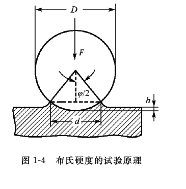 布氏硬度的试验原理如图1-4所示。将直径为D的钢球或硬质合金球,在一定载荷P的作用下压入试样表面,保持一定时间后卸除载荷,所施加的载荷与压痕表面积的比值即为布氏硬度。布氏硬度值可通过测量压痕平均直径d查表得到。