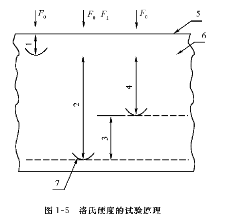洛氏硬度的试验原理如图1-5所示。在初载荷和总载荷(初载荷与主载荷之和)的先后作用下,将压头(金刚石圆锥体或钢球)压入试样表面,保持一定时间后卸除主载荷,用测量的残余压痕深度增量计算硬度值(