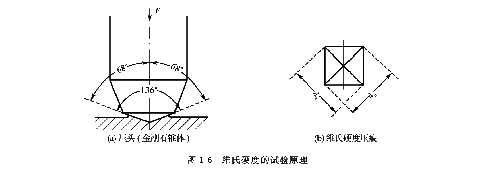 维氏硬度的试验原理如图1-6所示。将顶部两相对面具有规定角度(136°)的正四棱锥体金刚石压头在荷P的作用下压入试样表面,保持一定时间后卸除载荷,所施加的载荷与压痕表面积的比值即为维氏硬度。