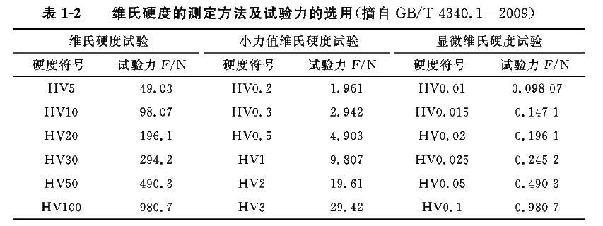 维氏硬度可通过测量压痕对角线长度d查表得到。维氏硬度用符号HV表示,符号前的数字为硬度值,后面的数字按顺序分别表示载荷值及载荷保持时间。如640HV30/20表示在294.2N载荷作用下保持20s测定的维氏硬度值为640。根据施加的载荷范围不同,规定了三种维氏硬度的测定方法,如表1-2所示。