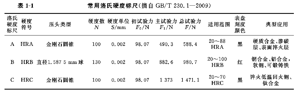 为卸除主载荷后残余压痕的深度)。洛氏硬度用符号HR表示,根据压头类型和主载荷不同,分为九个标尺,常用的标尺为A、B、C,如表1-1所示。符号HR前面的数字为硬度值,后面为使用的标尺,如50HRC表示用C标尺测定的洛氏硬度值为50。