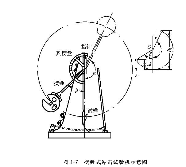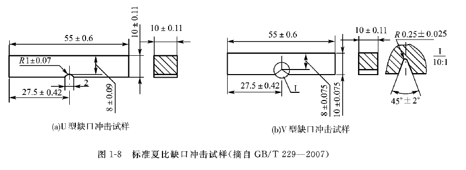 许多机械零件、构件或工具在服役时,会受到冲击载荷的作用,如活塞销、冲模和锻模等。材料抵抗冲击载荷作用而不破坏的能力称为冲击韧性。在如图1-7所示的摆锤式冲击试验机上用规定高度的摆锤对处于简支梁状态的缺口试样进行一次冲断,可测得冲击吸收功(单位为J),用Ak表示。试样缺口处单位横截面积的冲击吸收功称为冲击韧性值, 用表示。冲击试验所用试样为标准夏比缺口试样,如图1-8所示。