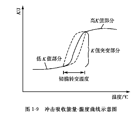 材料的冲击韧性随温度下降而下降。在某一温度范围内Ak值发生急剧下降的现象称为韧脆转变,发生韧脆转变的温度范围称为韧脆转变温度,如图1- 9所示。常在低温下服役的船舶、桥梁等结构材料的使用温度应高于其韧脆转变温度,如果使用温度低于韧脆转变温度,则材料处于脆性状态,可能发生低应力脆性破坏。应当指出的是,并非所有材料都有韧脆转变现象,如铝和铜合金等就没有韧脆转变。