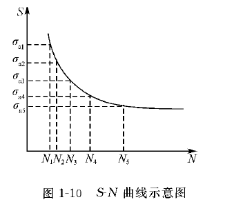 材料承受的交变应力σ与断裂时应力循环次数N之间的关系可用疲劳曲线来描述(见图1-10)。随σ下降,N值增加,材料经无数次应力循环后仍不发生断裂时的最大应力称为疲劳极限。对于对称循环交变应力的疲劳极限用σ-1表示。实际当中,作无限次应力循环的疲劳试验是不可能的,对于钢铁材料,一般规定疲劳极限对应的应力循环次数为107,有色金属为108。