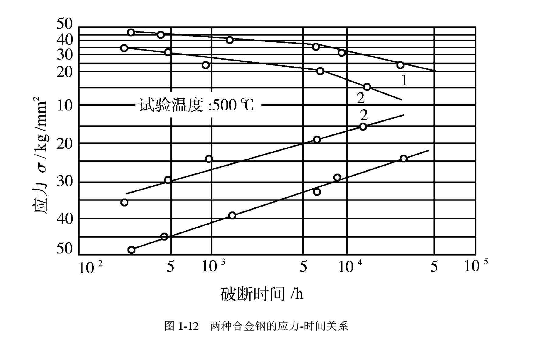 在高温下,应力与断裂时间在单对数和双对数坐标中都几乎呈直线关系,如图1-12所示。因此可以用高应力短时间的数据外推低应力下的持久寿命。但应注意的是,在双对数坐标中,应力-时间关系直线上存在折点,对需要长期使用的材料,如锅炉钢和汽轮机用钢等,必须进行较长时间的试验,并只能外推一个数量级,否则将得到数值过高的错误结果。