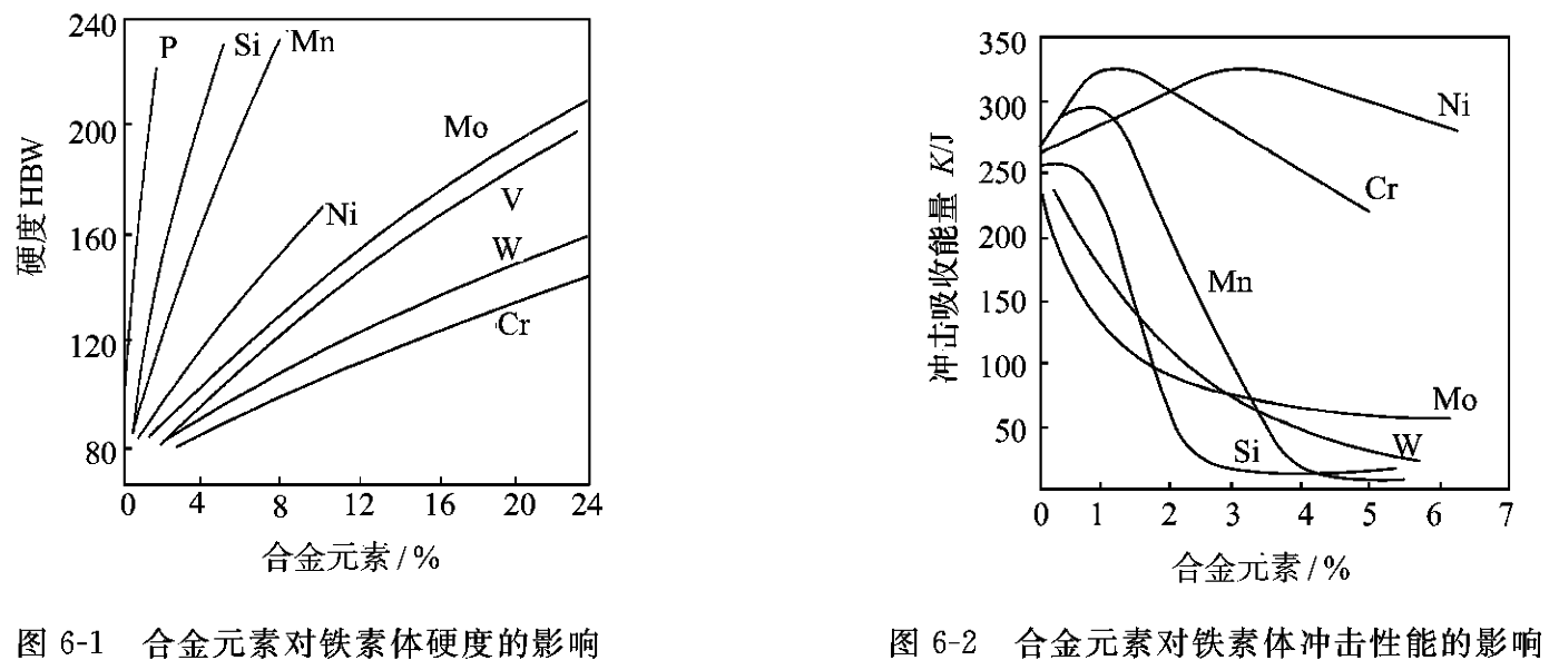 加入钢中的非碳化物形成元素及过剩的碳化物形成元素都将溶于铁素体,形成合金铁素体,起固溶强化作用。图6-1和图6-2为几种合金元素对铁素体硬度和韧性的影响,可以看出,P、Si、Mn的固溶强化效果最显著,但当其含量超过一定值后,铁素体的韧性将急剧下降。而Cr、Ni在适当的含量范围内不但能提高铁素体的硬度,而且还提高其韧性。因此,为了获得良好的强化效果,应控制固溶强化元素在钢中含量。