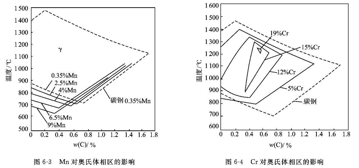图6-3和图6-4分别为锰和铬对奥氏体相区的影响。