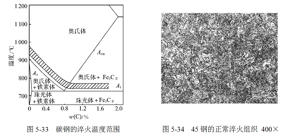 碳钢的淬火温度可利用铁碳相图来选择,如图5-33所示。对于亚共析钢,淬火温度为Ac3+30~50℃。当含