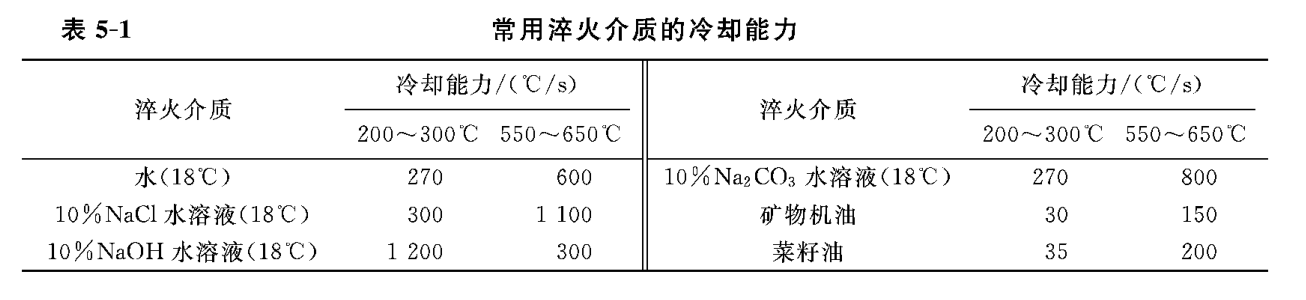 水是经济的且冷却能力较强的淬火介质。如表5-1 所示,水的缺点是在650~550℃范围内的冷却能力不够强,在300~200℃范围内冷却能力又太大。因此生产上水主要用于形状简单、截面较大的碳钢件的淬火。